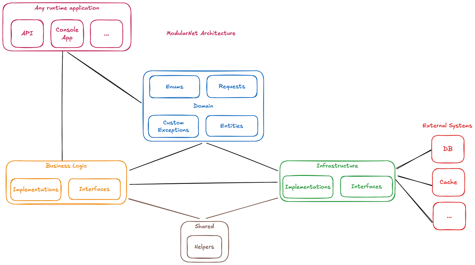 ModularNet is a layered, modular architecture designed for building robust, maintainable, and testable .NET applications. It emphasizes a strong separation of concerns, leveraging Dependency Injection and interface-based communication between layers.